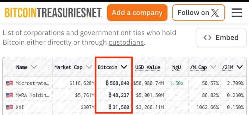 BTC保有数ランキング(画像:Bitcoin Treasuries)