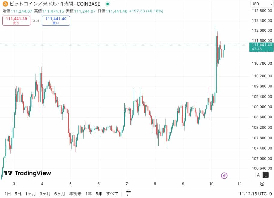 この発言を受けて市場では流動性拡大への期待が高まり、投稿から30分以内にビットコイン価格は急騰して11万ドル付近まで到達しました。FRB利下げ観測を背景に「リスク資産への資金シフト」が進み、これが価格上昇の一因となったと考えられています。