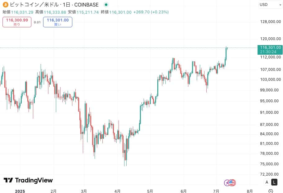 記事執筆時点におけるビットコインの価格は約11万6,000ドル(約1,690万円)で、過去最高値に近い水準で堅調に推移しています。