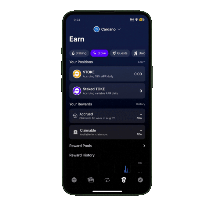 これらのステーキング機能はTokeoアプリ内の「Earn」ページにある「Stoke」タブから利用することが可能で、各プールの報酬はADAで支払われ、報酬は毎月最初の1週間に請求できる仕組みとなっています(※将来的にはADA以外の通貨が報酬に使用される可能性あり)。