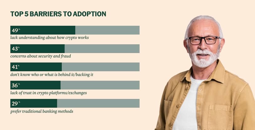加えて「セキュリティ面への不安」が43%、「仮想通貨プラットフォームに対する不信感」が36%に上っており、全体として理解不足と不信感が浮き彫りになっています。