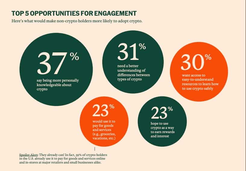 仮想通貨の利用に前向きになるために必要な条件として「より多くの知識を身につけること」が37%、「仮想通貨ごとの違いを理解すること」が31%を占めています。