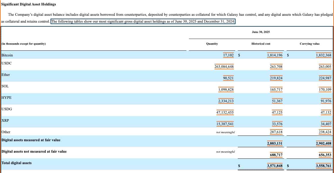 2025年第2四半期(4〜6月期)の報告書(フォーム10-Q)によると、ギャラクシー・デジタルは6月末時点で17,102 BTC(19.6億ドル/2,904億円相当)や1,098,828 SOL(1.8億ドル/275億円相当)を保有し、ビットコインが最大の保有銘柄とされています。