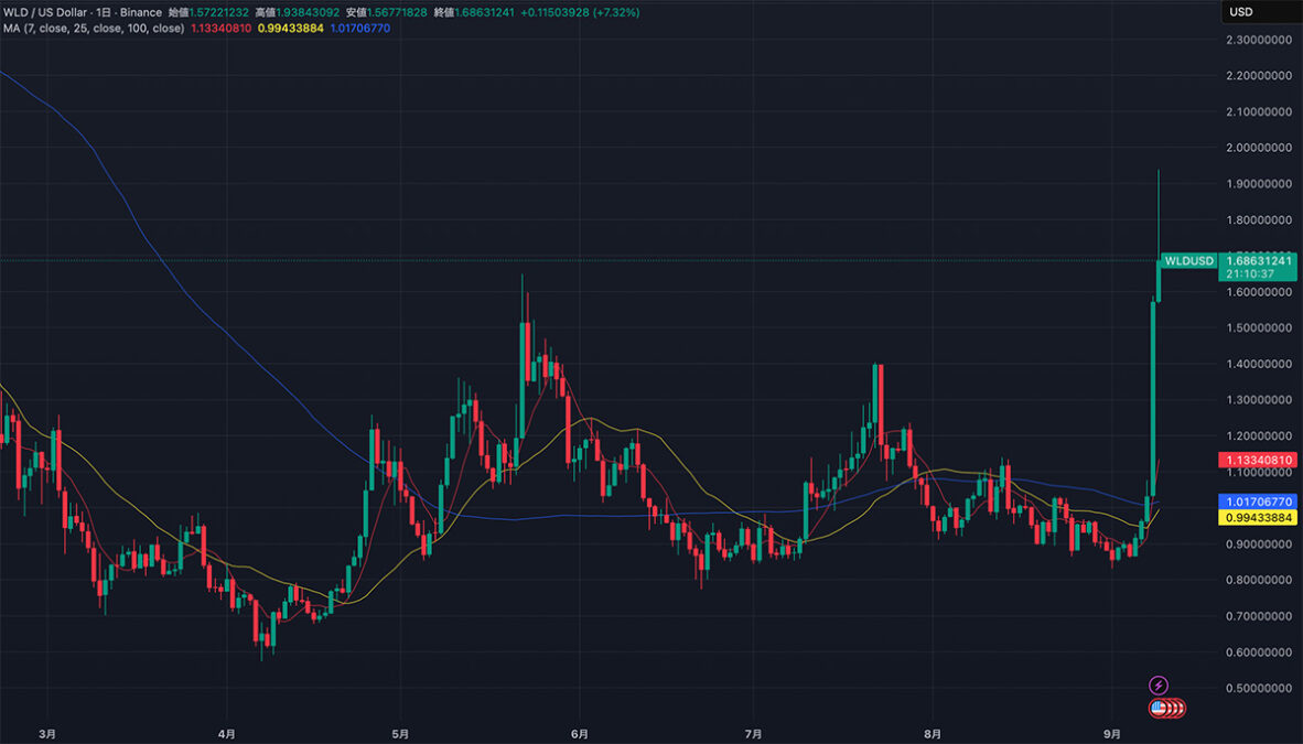 2025年2月21日〜2025年9月9日 WLD/USDの1日足チャート(画像:TradingView)2025年2月21日〜2025年9月9日 WLD/USDの1日足チャート(画像:TradingView)