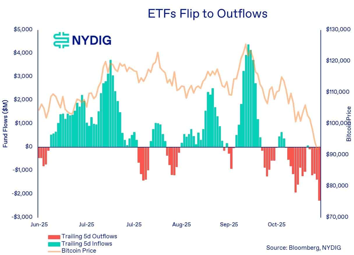 NYDIGは、これまで相場の「機械的な買い手)」だったETFへの資金流入が停滞・逆転した結果、ビットコイン市場に対し新たな下押し圧力となっていると分析しています。