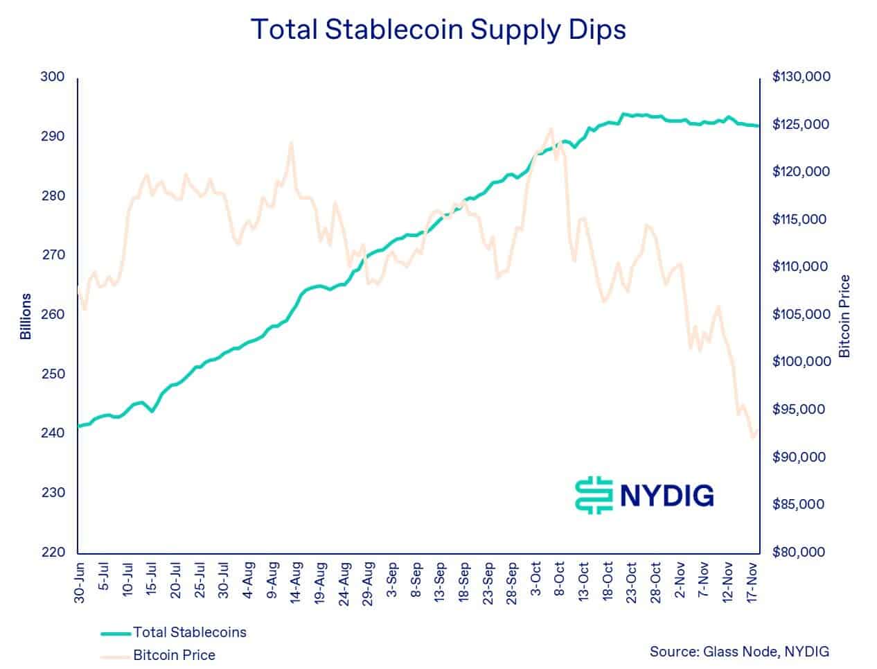 NYDIGは、仮想通貨エコシステム内の「待機資金」とも言えるステーブルコインの供給量にも停滞がみられる点も指摘しています。