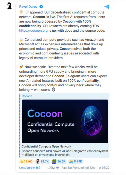 メッセージアプリ「Telegram」の創設者であるパベル・ドゥーロフ氏は2025年12月1日に、The Open Network(TON)のブロックチェーン上に構築された分散型の機密AIコンピュートネットワークである「Cocoon」が正式に稼働開始したことを発表しました。