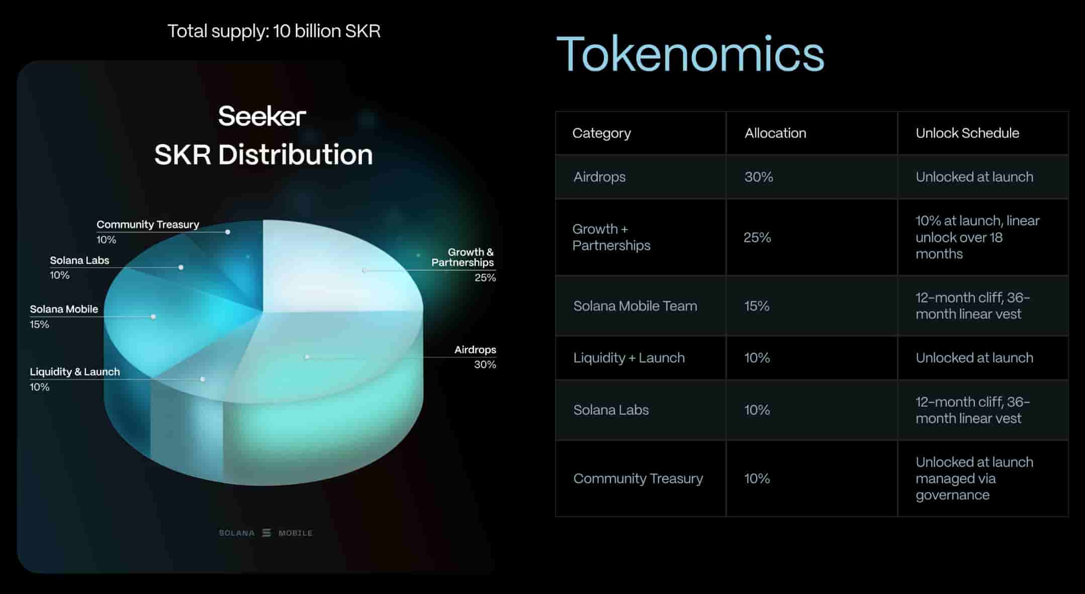 公式ブログによると、総供給量100億枚のSKRは、ユーザー向けエアドロップに30%、エコシステムの成長支援やパートナーシップに25%、流動性供給とローンチ支援に10%が割り当てられる計画で、残りはコミュニティ財務やソラナモバイル、Solana Labsに配分されます。
