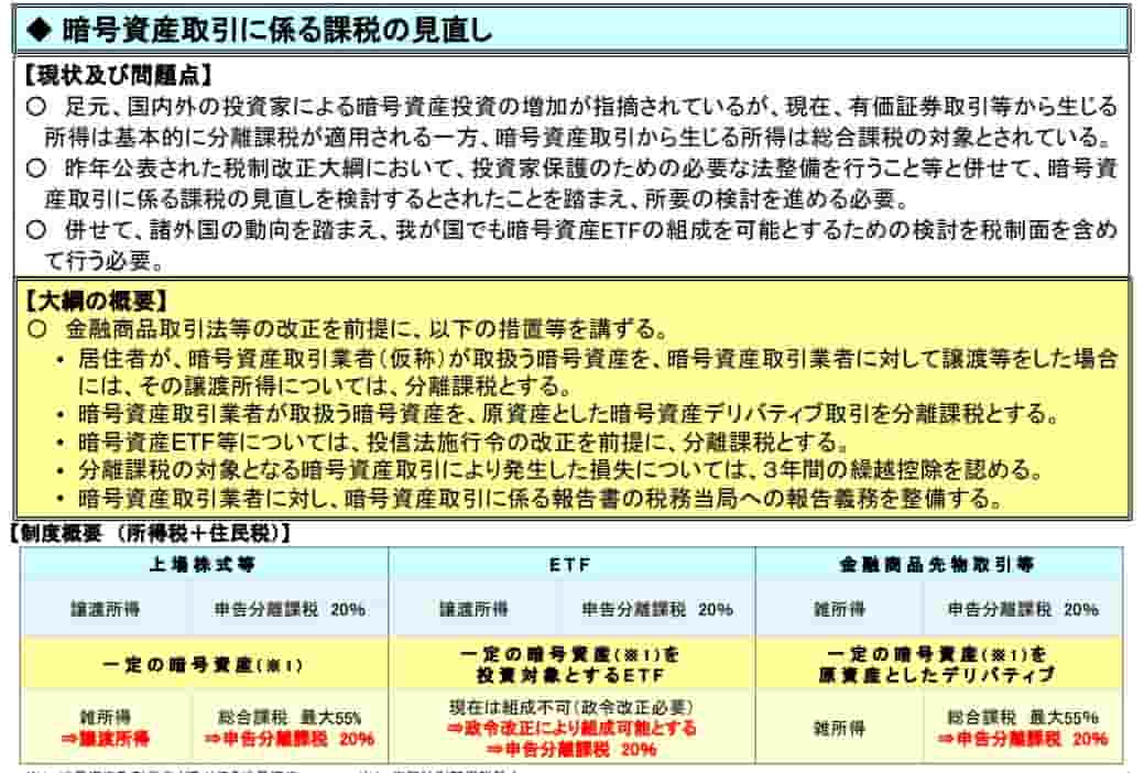 - 暗号資産ETFは、投資信託法施行令の改正後に組成可能とし、申告分離課税とする