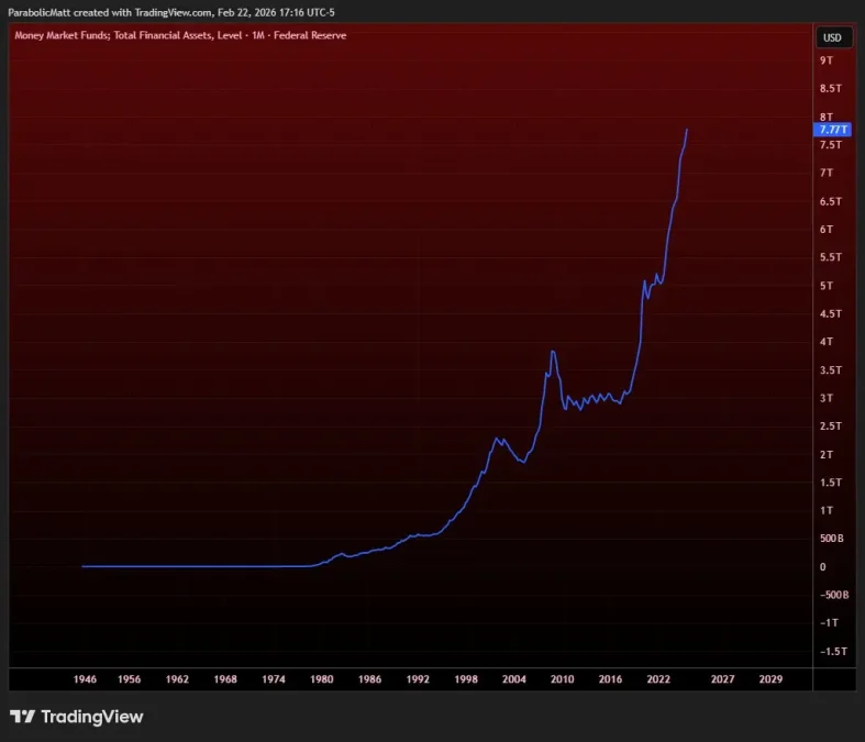 米国のマネーマーケットファンドに滞留する約7.77兆ドル(約1,190兆円)の資金について、仮想通貨アナリストのマシュー・ハイランド氏は2026年2月23日、自身のX(旧Twitter)への投稿で、その影響が市場にまだ十分に及んでいないとの見解を示しました。