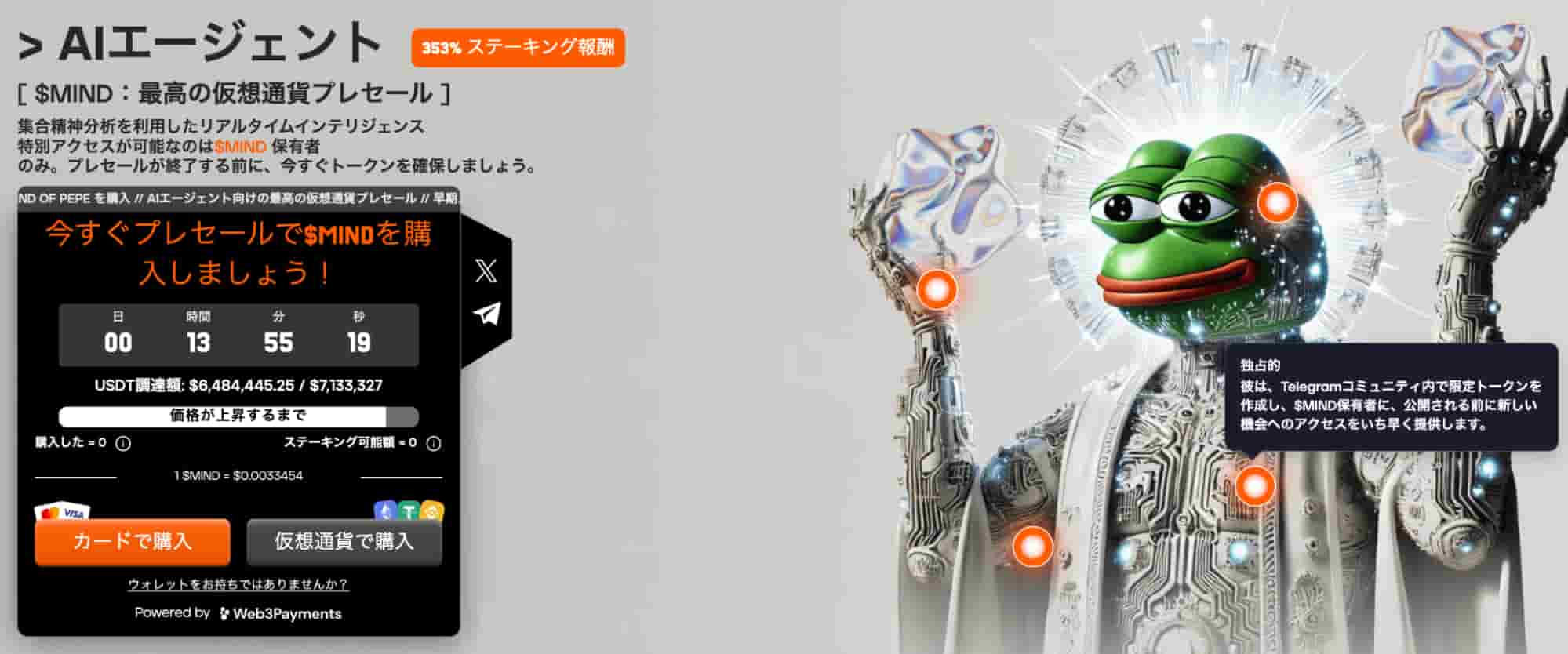 Mind of Pepeは、自己主権型AIエージェントへのアクセスを投資家に提供するAI仮想通貨プロジェクトです。