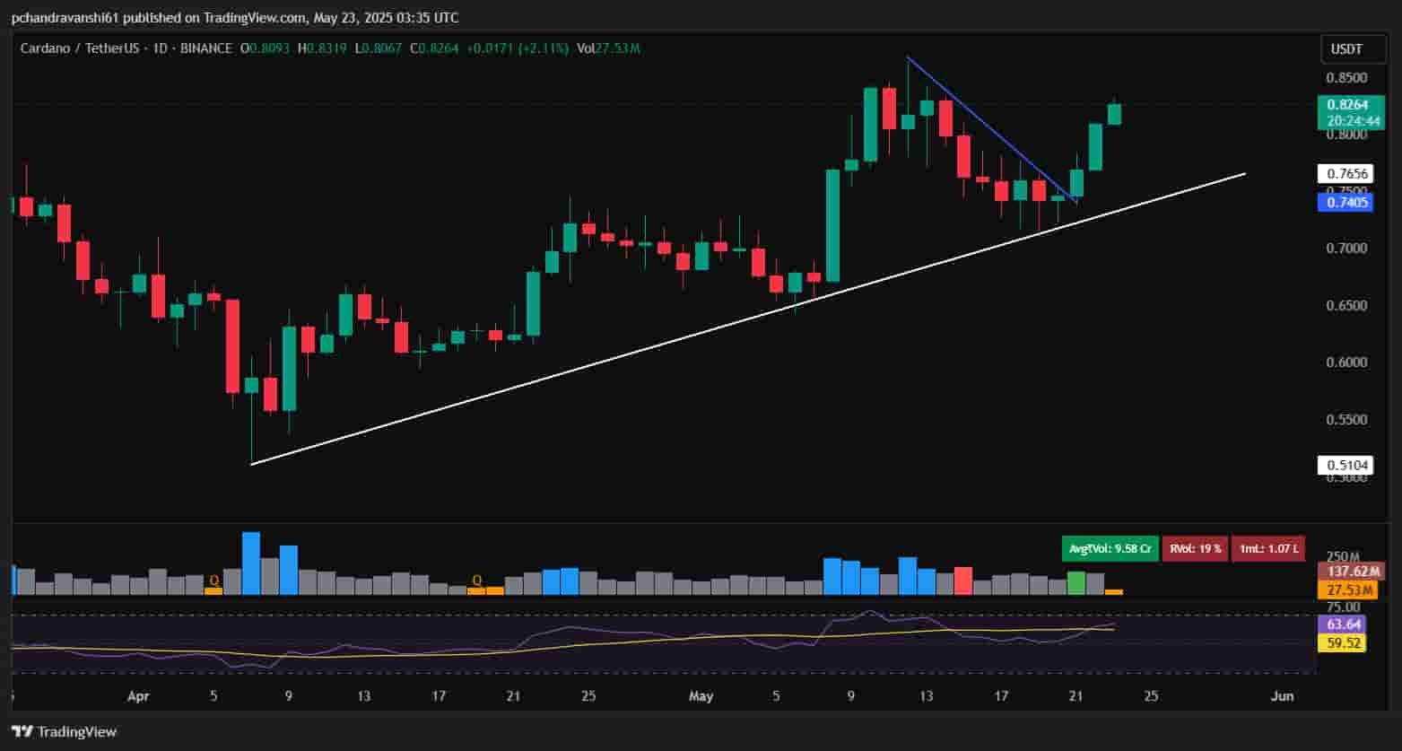 ADA の価格は、4月の安値0.51ドルから65%を超える上昇、2ヶ月ぶりの高値0.86ドルを記録しました。2025年5月22日現在、カルダノのオープンインタレストは9億6,500万ドルに達し、数週間前の7億ドルから大幅な増加を示しています。この上昇は、ADA の取引活動に対するトレーダーの信頼が高まっていることを示しています。