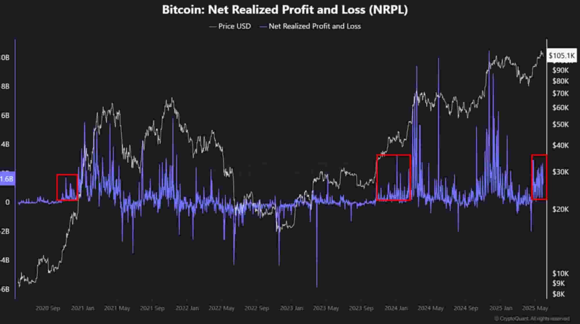 CryptoQuant のデータによると、利益確定売りは2024年3月と11月のサイクルピーク時に見られた激しい売り圧力に比べ、依然として穏やかな水準にとどまっており、ビットコインの上昇トレンドはまだまだ続く可能性が高いとみられる。