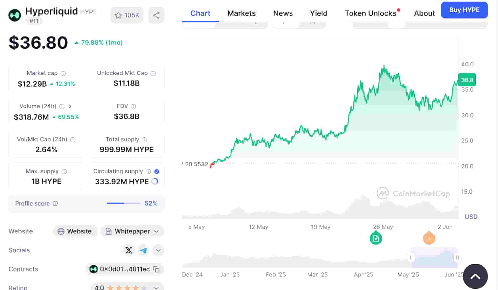ブロックチェーンのニュースによると、最近のクジラの活動は機関投資家の関心を高めており、あるクジラが110,824  HYPE を399万ドルで購入、その後4倍のレバレッジをかけたロングポジションを構築した。