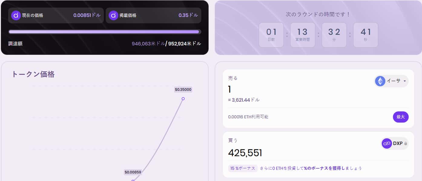 トークンの価格は$0.00826で、上場時の価格は$0.35が予定されています。$DXPトークンは、Ethereum、BNBチェーン、Solana、XRPレジャー、Bitcoin、または対応ネットワーク上のUSDT経由、さらに銀行カードでの決済も可能です。