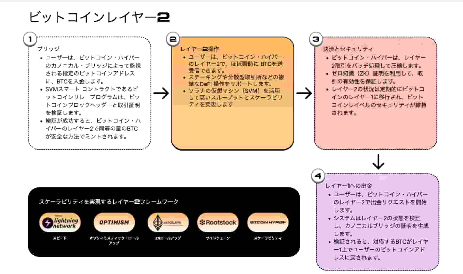 このレイヤー2では、全ての取引処理はオフチェーンで行われること、取引はビットコインチェーン上でまとめて処理されること、取引は検証可能で改ざんできないことが説明されています。