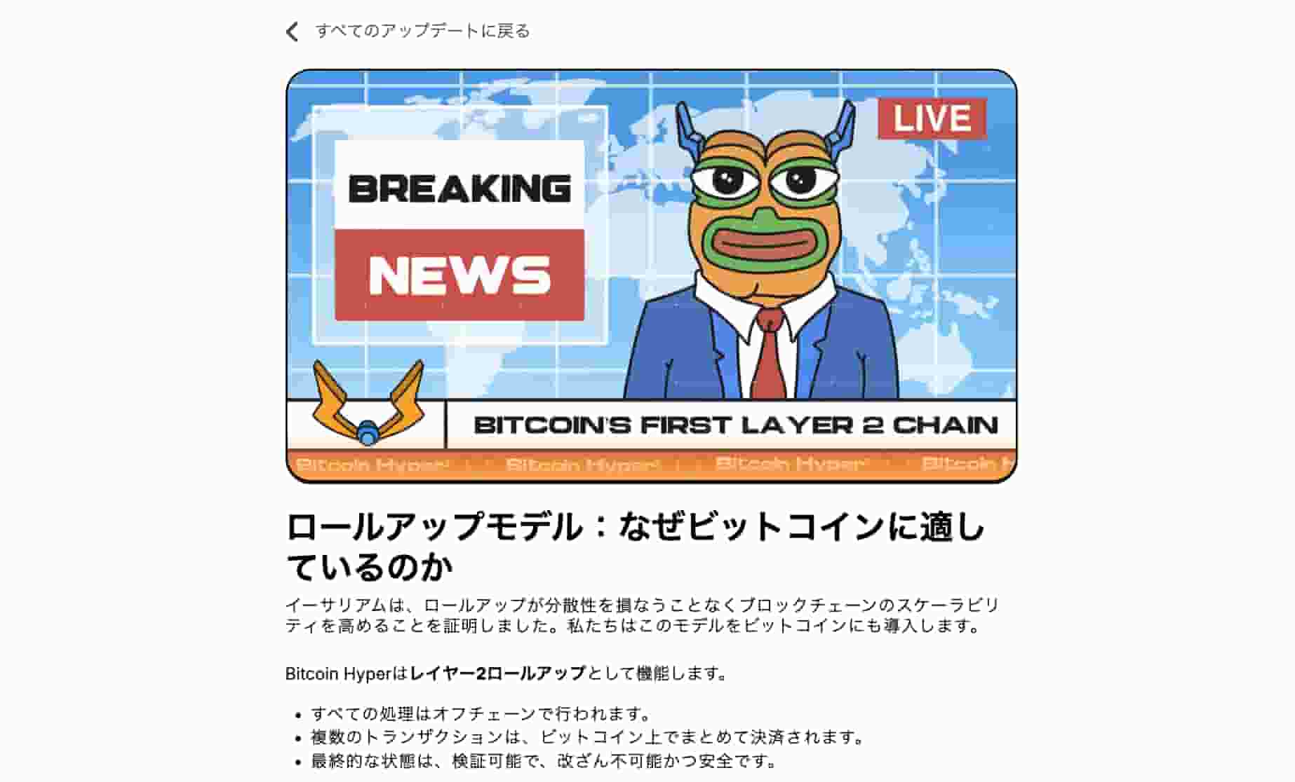 今回のアップデートでは、イーサリアムで主流となっているロールアップモデルを、Bitcoin Hyperのレイヤー2に取り入れたことが取り上げられています。