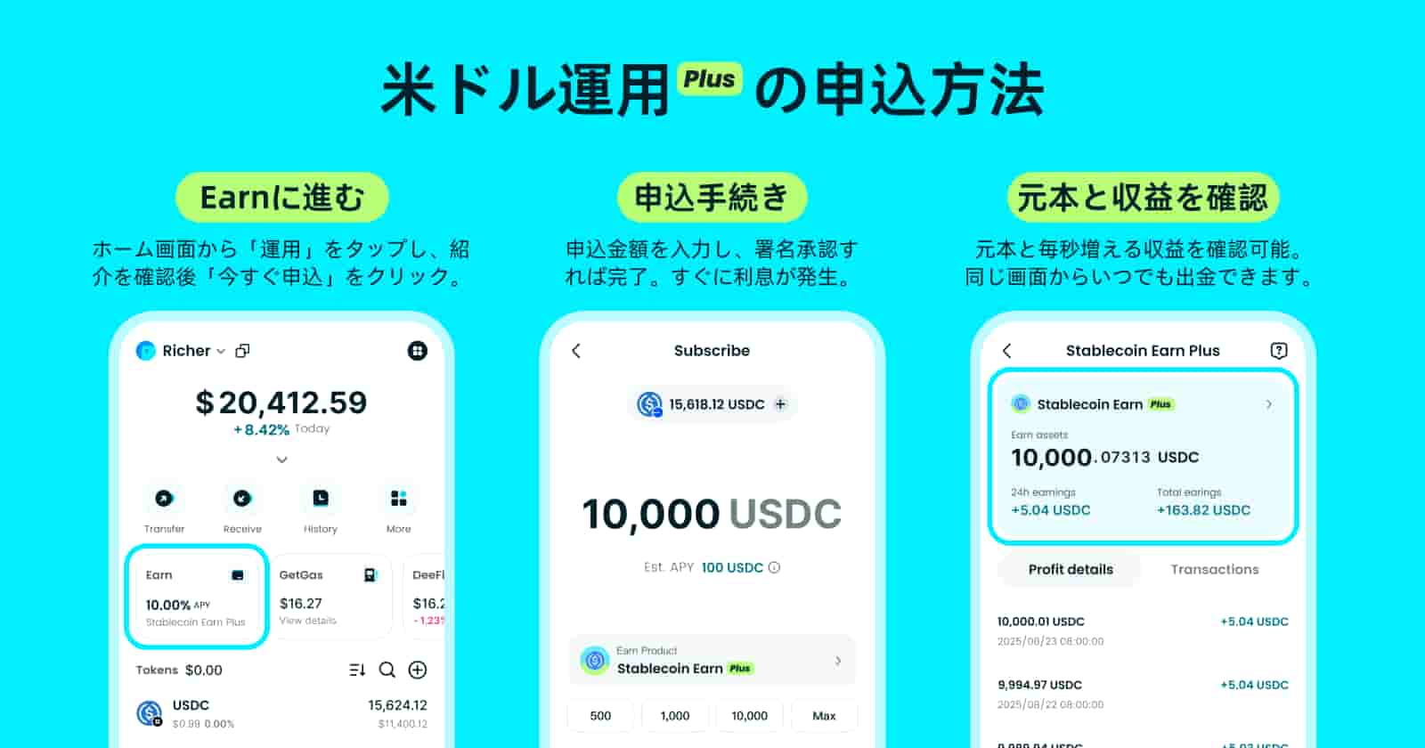 この商品は、ユーザーが提供したUSDCをBaseネットワーク上のAaveの過剰担保貸付プールに流し込み、借り手からの利息はBitget Walletによって補填され、最大10,000米ドルの預金に対して最低10%のAPYを保証します。1ドルから投資可能で、収益はリアルタイムで発生され、出金は数秒で処理されます。これにより、預金は送金、取引、決済に流動性が維持されます。資金の解放に数日かかり、年間2%未満の金利しか提供できない従来の銀行商品とは対照的です。