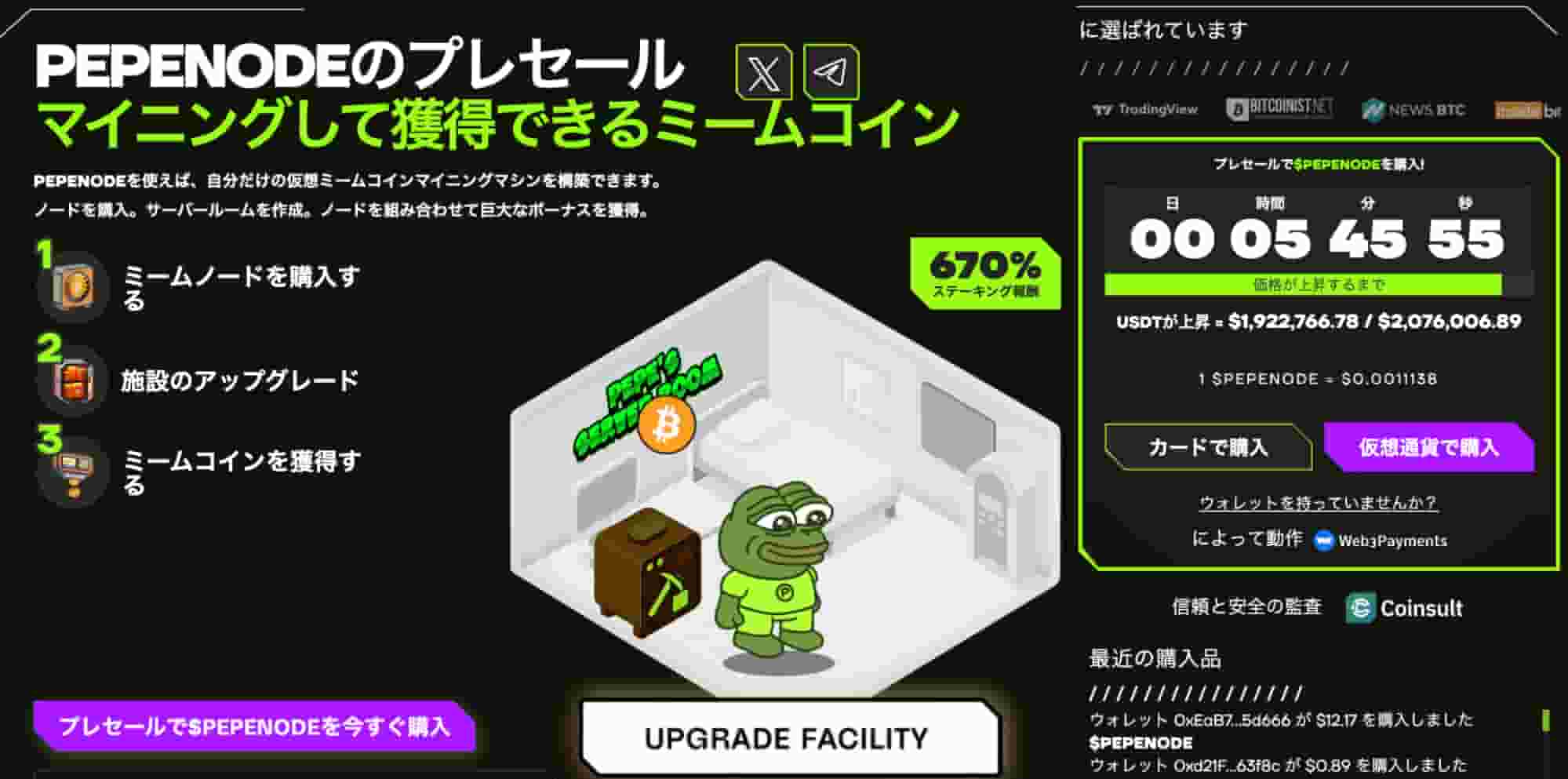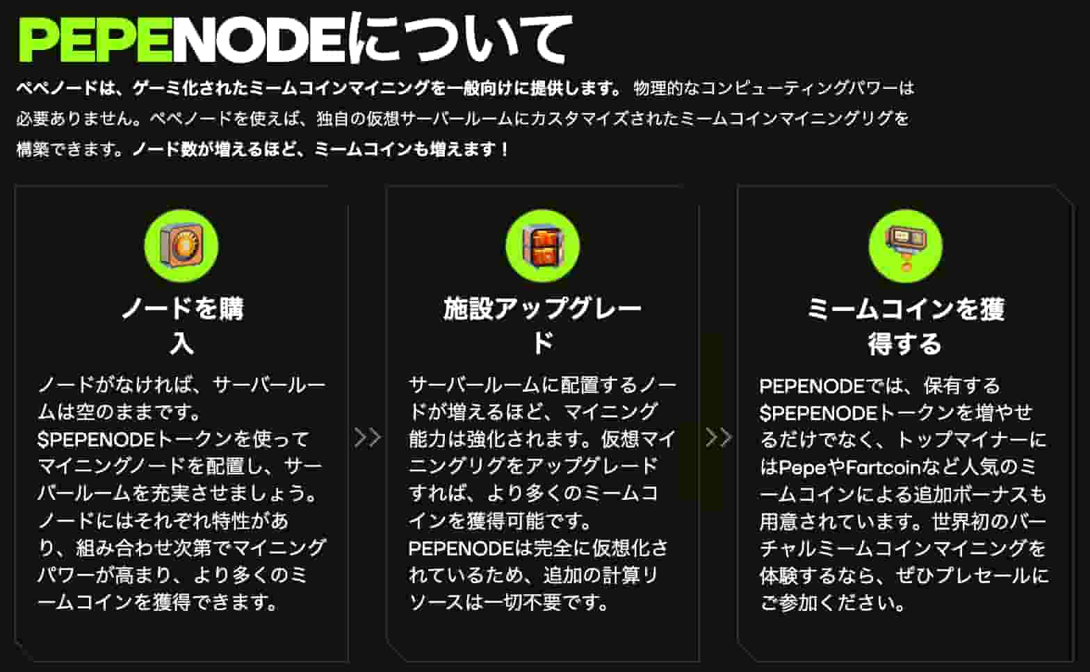 $PEPENODEは、ぺぺ関連のミームコインとしての特徴も持ちながら、マイニングによる実用性も備わっているため、成長ポテンシャルの高い銘柄として注目を集めているようです。
