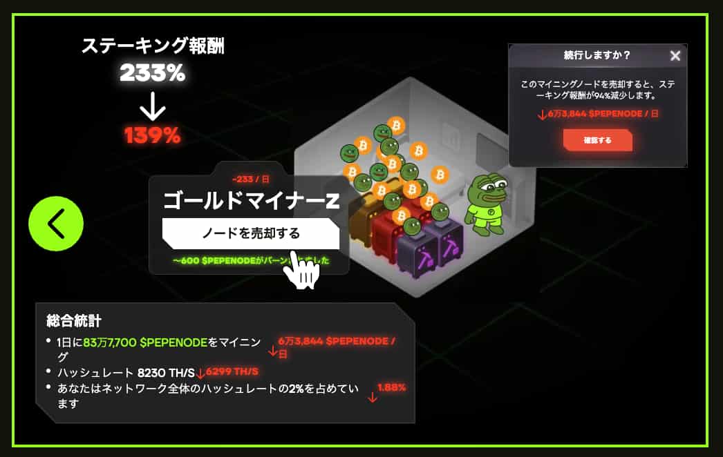 このように、ノードの組み合わせを変えることで戦略的に報酬を獲得できるため、Pepenodeのマイニングはゲーム要素が強いと評価されています。